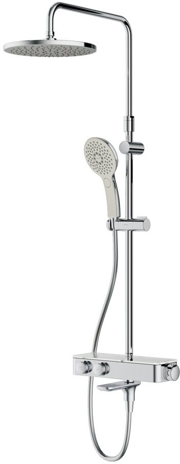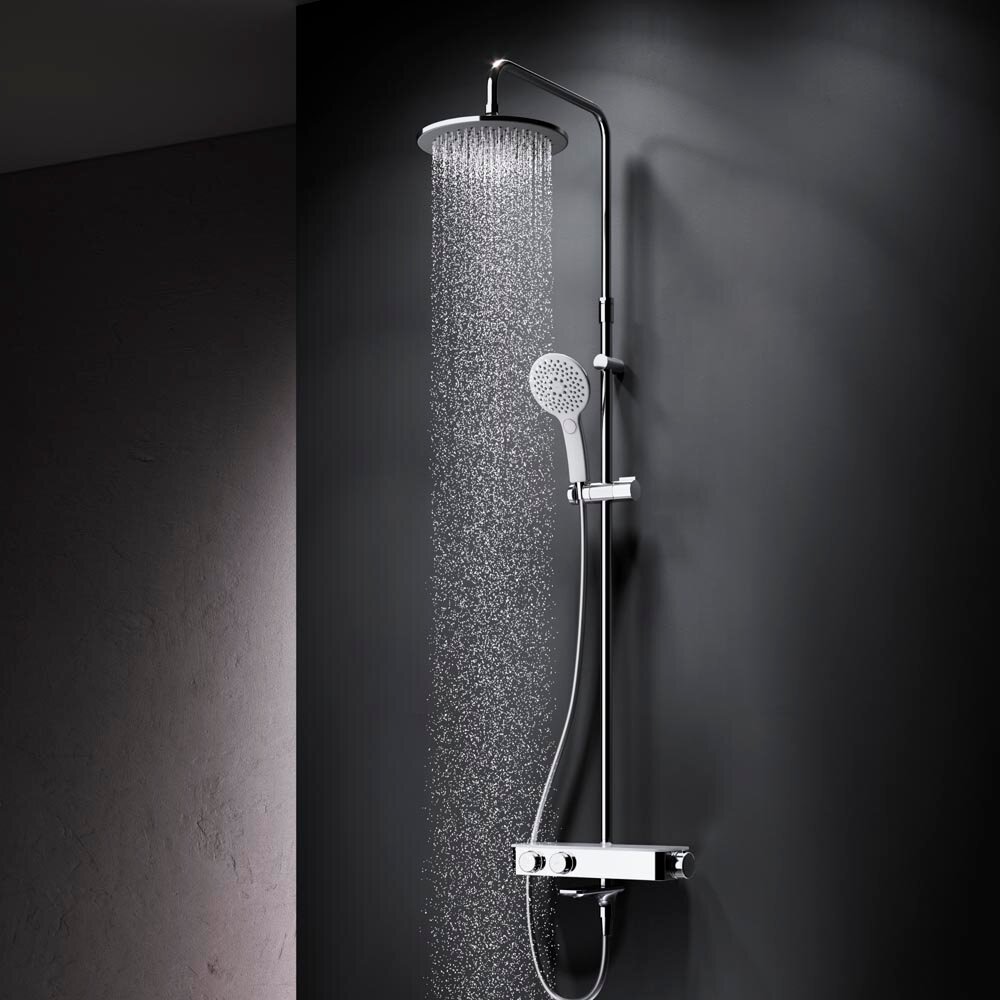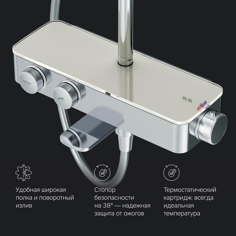 Продукт оснащен термостатическим смесителем для поддержания неизменной температуры воды. Верхняя часть смесителя выполнена из глянцевого стекла и является интегрированной полочкой для нужных мелочей при приёме душа.