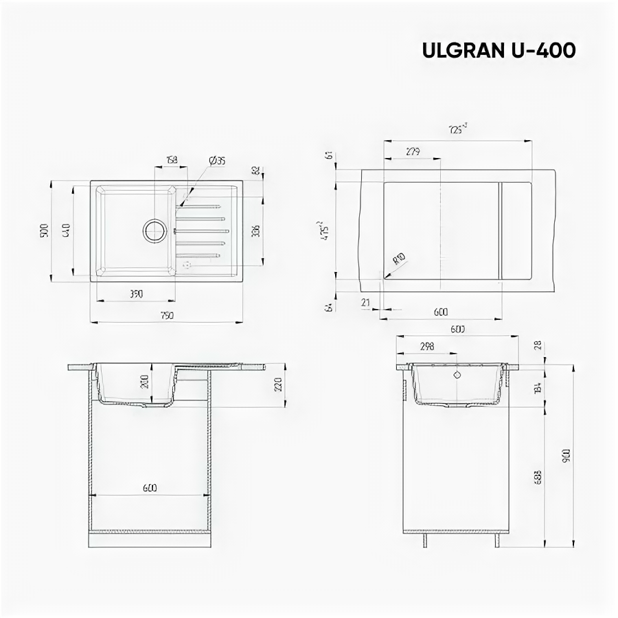 ULGRAN U-400 - односекционная классическая реверсивная кухонная мойка, с вместительной чашей. Данная мойка устанавливается в шкаф шириной от 60 см и является оборачиваемой. В комплектацию входит сливная арматура с гофротрубой, технический паспорт и гарантийный талон. Заводская гарантия составляет 2 года, а срок службы данной мойки, при соблюдении основных правил ухода за ней, составляет более 10 лет.Мойки ULGRAN изготавливаются на современном автоматизированном оборудовании по инжекционной технологии (литье под давлением) и имеют сравнительно малый вес при высокой прочности, что обеспечивает высокий уровень качества и комфортности. Благодаря сочетанию полиэфирных смол и натуральных мраморных наполнителей полученный композитный материал в 8 раз прочнее натурального мрамора, абсолютно экологичен и безопасен для здоровья человека. Декоративно-защитное покрытие - гелькоут не имеет микропор и не впитывает никакие бытовые загрязнения, устойчиво к ультрафиолету, имеет антибактериальные свойства и надежно защищает от механических повреждений. Мойки ULGRAN устойчивы к термическим воздействиям и кипятку, имеют отличное шумопоглощение при падении струи воды и увеличенное сопротивление внешнему износу (царапинам, ударам). Мойки просты в уходе и без труда чистятся неабразивными средствами, очень долго сохраняя свой цвет и первозданный внешний вид.