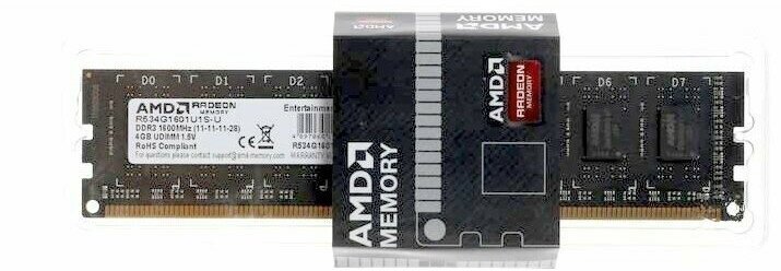 Модуль памяти DDR3 4GB AMD 1600MHz PC3-12800 CL11 1.5V Non-ECC Retail R534G1601U1S-U