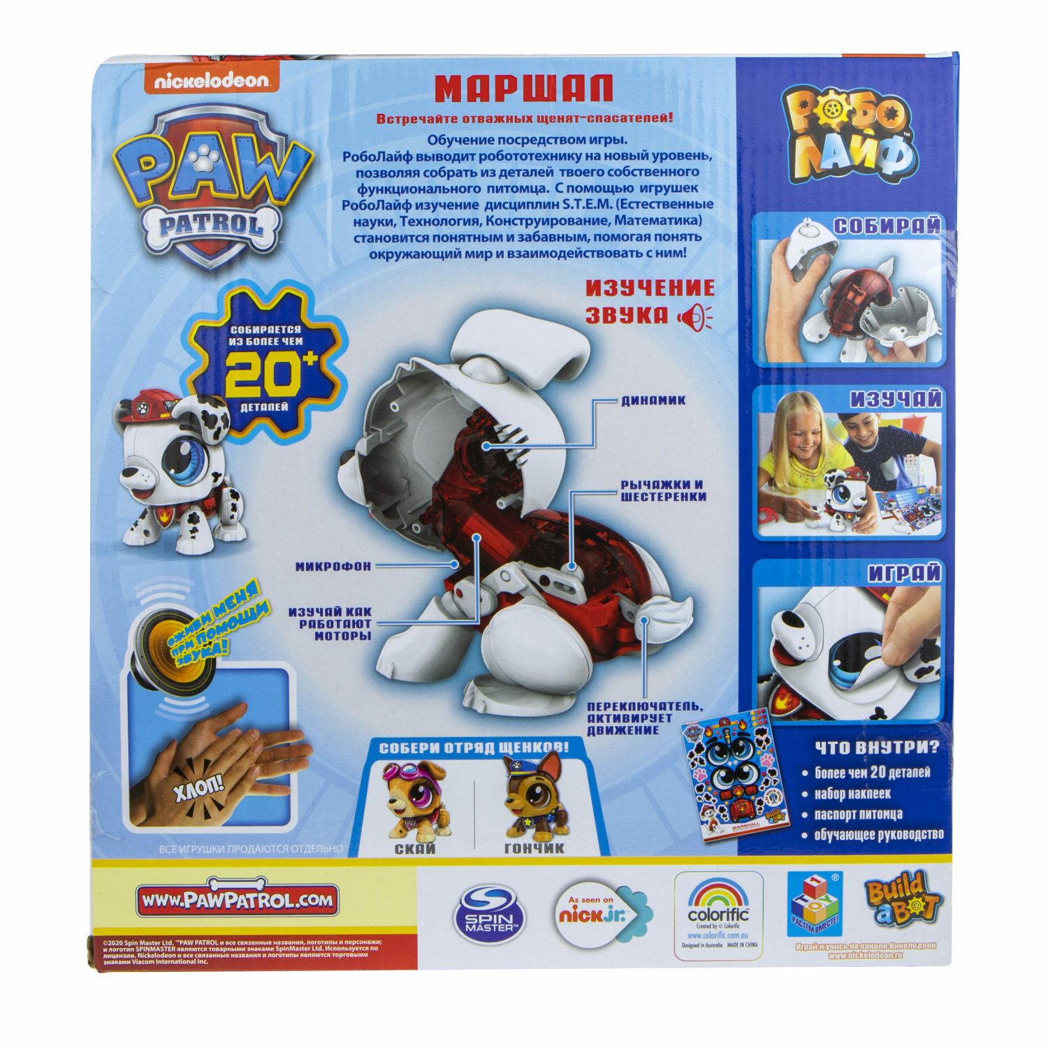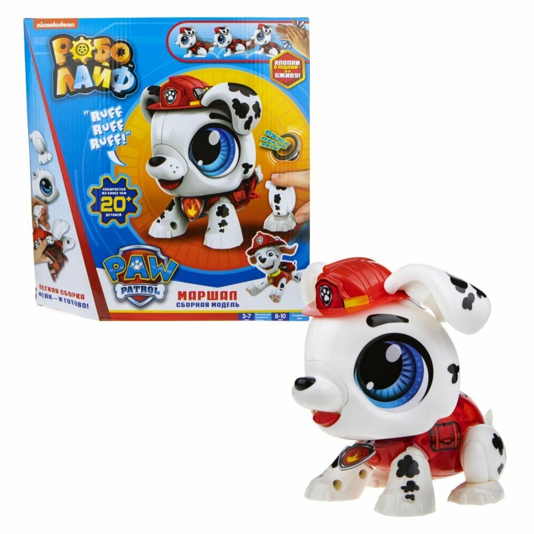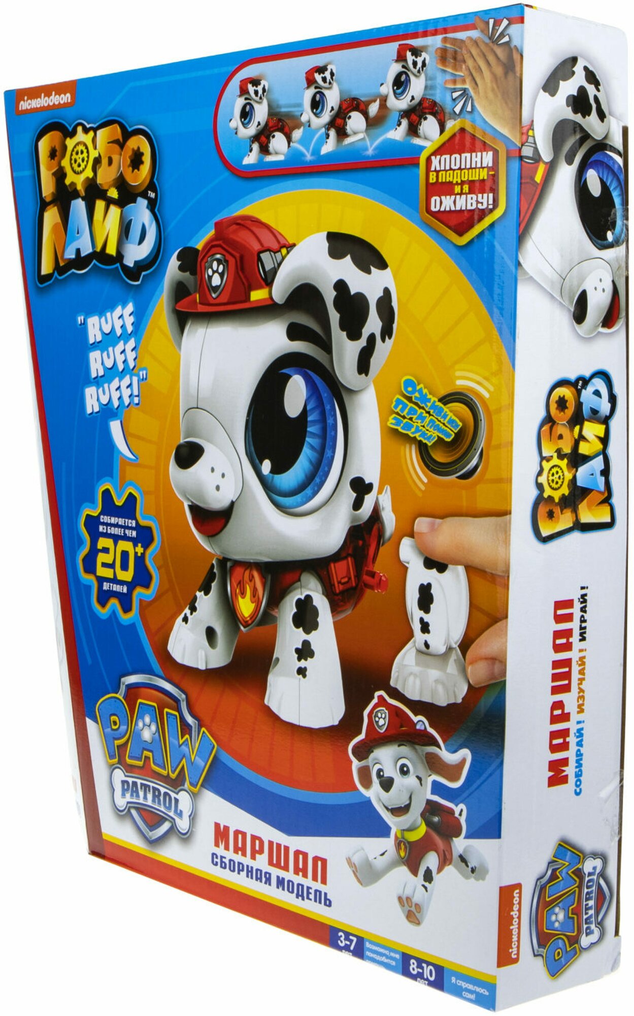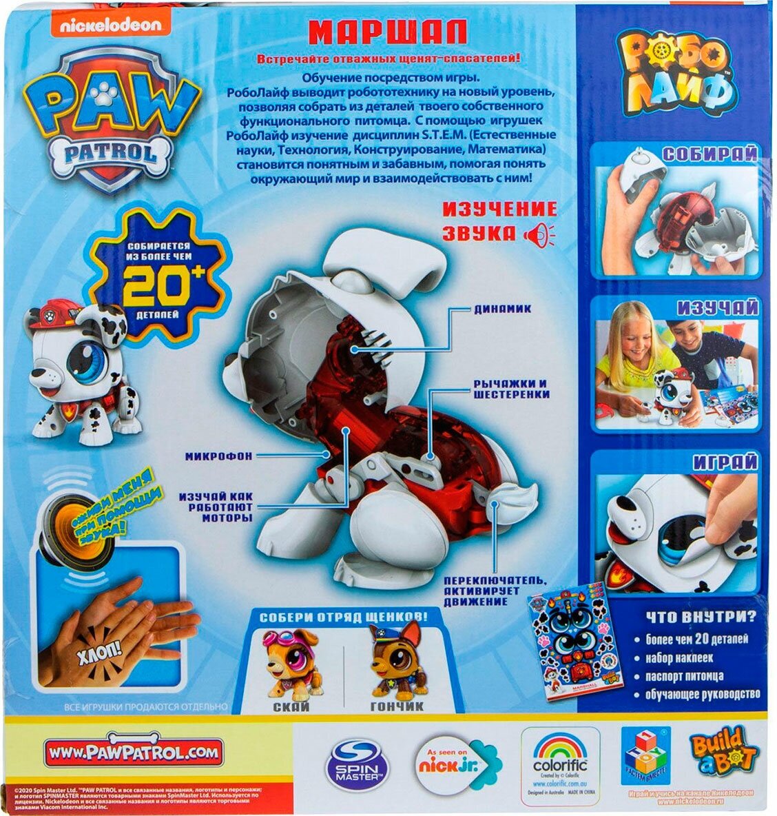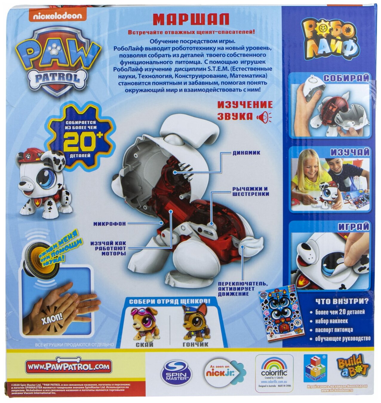 Щенячий патруль (Paw Patrol) РобоЛайф Маршал интерактивный – это набор для создания своими руками интерактивного питомца, который познакомит ребёнка с основами робототехники и конструирования, а также позволит проявить фантазию на этапе украшения. Собрать Щенка будет совсем не сложно, если следовать пошаговой подробной инструкции. Соберите из деталек интерактивного робота и украсьте его наклейками. Среди наклеек есть даже несколько пар глаз разного цвета, чтобы придать игрушке индивидуальность! Украсили - начинайте с ним играть: созданный робот-зверь будет радовать, словно живой! Щенок будет двигаться, если поднять его хвостик, а если похлопать перед ним в ладоши, то он начнёт прыгать и издавать забавные звуки. Не забудьте придумать своему роботизированному питомцу имя и заполните его паспорт: внесите туда кличку и данные о сборке - дату, место и имя создателя. Внутри коробки тебя ждут: более чем 20 деталей для сборки, набор наклеек, паспорт питомца и обучающее руководство. Работает от 2-х батареек (не входят в комплект).