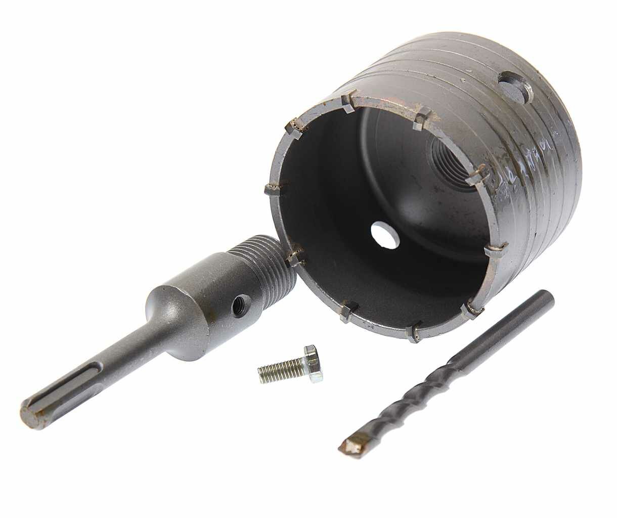 На внешней стороне коронки нарезана спиральная канавка для улучшения вывода продуктов сверления и снижения нагрузки на перфоратор. Твердосплавные зубья из сплава марки ВК8. Корпус коронки изготовлен из углеродистой стали. Хвостовик SDS-PLUS. Резьбовое крепление коронки к хвостовику.