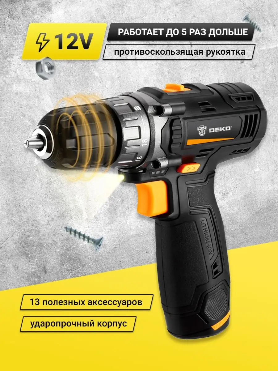 - ОНЛАЙН ТРЕЙД.РУ - Аккумуляторная дрель-шуруповерт DEKO GCD12DU3 2*12В 1.5Ач, набор 13 предметов