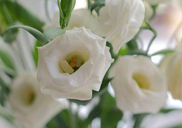 Роскошное и очень нежное однолетнее растение из семейства Горечавковые. Стебли высотой до 70 см, сильные, прочные, способные выдержать крупные, плотные, махровые цветки. Изысканные оттенки и 100 процентов махровость сделала эту серию фаворитом на рынке срезочных лизиантусов. Довольно крупные (5-6 см) белые цветки, в пору цветения похожи на полуоткрытые бутоны розы, с атласными, спиралевидно расположенными лепестками. Предпочитает солнечные места, окультуренную почву, регулярные поливы и опрыскивания. Для получения цветущих растений в июле - августе посевы производят в конце февраля - начале марта. Семена мелкие, их не присыпают, оставляя на поверхности субстрата, увлажняют из распылителя и накрывают стеклом. Всходы появляются через 10-15 дней при температуре +20-21 градусов. Необходим свет. Сеянцы пикируют в стадии 2-3-х настоящих листьев в отдельные горшки. В грунт высаживают, когда минует угроза заморозков. Используют для украшения клумб, рабаток, бордюров и срезки.