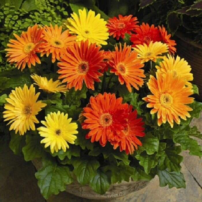Очень жизнерадостное и яркое многолетнее растение высотой до 50 см для выращивания в комнатных условиях или на балконе. Образует укороченные стебли с розетками прикорневых удлиненных листьев над которыми возвышаются опушенные цветоносы с нарядными корзинками ромашковидных соцветий. Гербера очень светолюбива и теплолюбива, предпочитает слабокислые почвы, регулярный умеренный полив в период активного роста и цветения. Застой влаги в почве и розетке растения, может стать причиной появления грибковых заболеваний и мучнистой росы. Семена высевают в смесь из дерновой, листовой и перегнойной земли (2:1:1) с добавлением песка и регулярно увлажняют посевы. Всходы первый раз пикируют в фазе 2-3 настоящих листьев в ящики, а второй раз, в фазе 4-5 листьев, в отдельные горшки. Через месяц после последней пикировки растения удобряют миниральным удобрением с полным набором микроэлементов. Дальнейшие подкормки благотворно влияют на продолжительность цветения. От посева до цветения проходит до 10-11 месяцев. Зимой температуру содержания снижают до 10-12 Градусов Цельсия, устанавливают ограниченный полив, цветение прекращается и у герберы наступает период покоя.