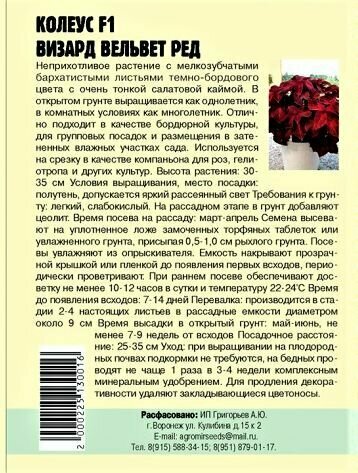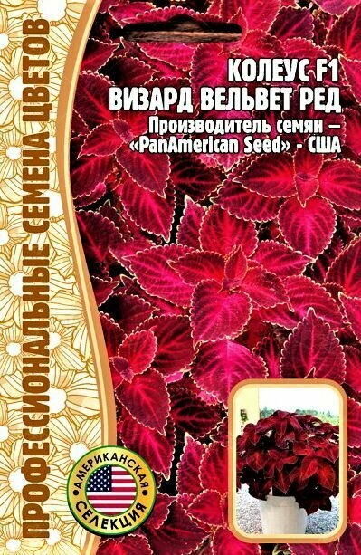 Семена Колеус Визард Вельвет Ред, 5шт, Гавриш, Элитная клумба, Многолетнее растение из семейства Губоцветные, выращиваемое в открытом грунте как однолетнее. Компактный кустик, высотой 30-35 см, диаметром 25-30 см. Листья красно-бордовые овальные, по краям крупнозубчатые с салатовой каймой, напоминающие по форме листья крапивы. Колеус предпочитает солнечные или слегка притененные места с богатой, легкой, кисловатой почвой. В феврале семена высевают на рассаду в смесь из листовой, торфяной, дерновой земли и песка (1:1:1:1) и слегка присыпают песком. При температуре 20-22С и постоянном увлажнении всходы появляются через 14-18 дней. Подросшие растения пикируют и прищипывают (высота сеянцев не менее 10 см) для лучшего ветвления. На постоянное место высаживают в июне. Осенью растения можно пересадить в горшочки и перенести в комнату. Используют для оформления бордюров, высаживают массивами, комбинируя с другими низкорослыми однолетниками.
