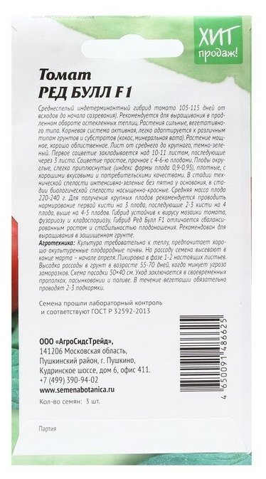 | Комплектация | Семена овощей Томат Ред Булл F1 3шт - 1 уп |