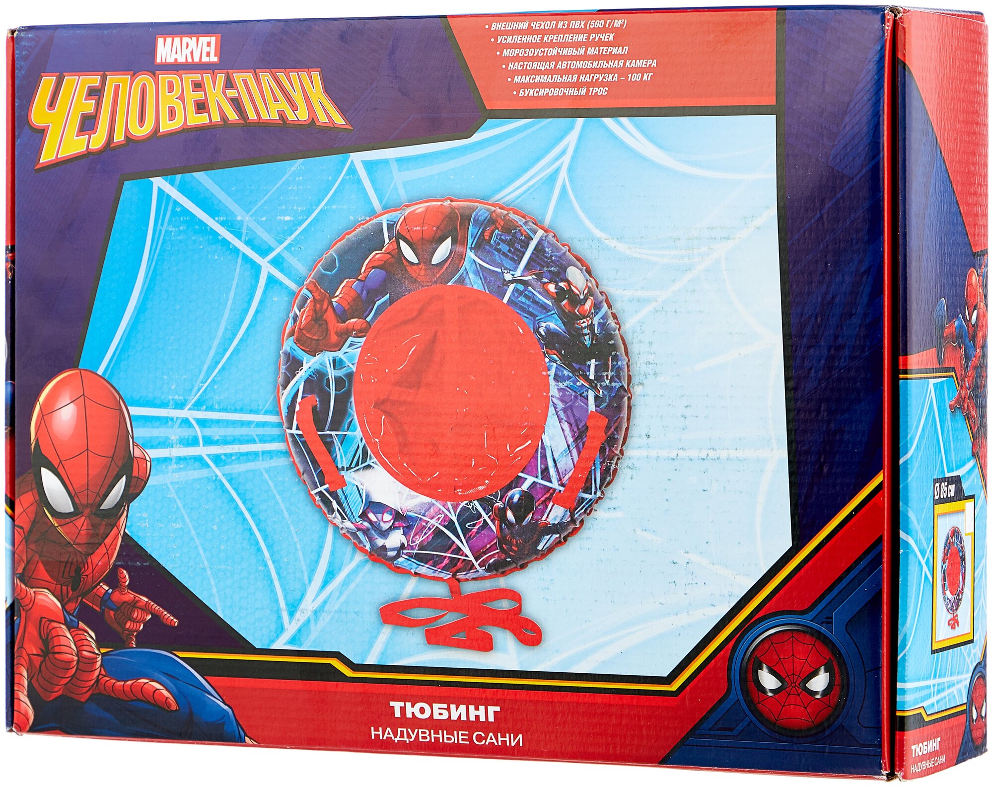 Надувные санки круглые, диаметр 100 см, в стиле вселенной Марвел Человек-паук. На бортиках изображение супергероя. Имеется длинный трос для буксировки и 2 удобные ручки. Корпус из ПВХ с глянцевой поверхностью, устойчивый к деформации. Камера поглощает удары и вибрации. Сиденье в виде ниши, повторяет формы тела ребенка, оснащено трикотажными тесемками. Перед использованием необходимо надуть автокамеру из прочной резины.