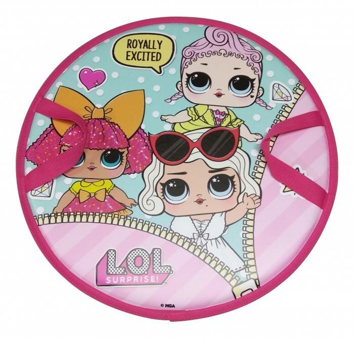 Ледянка круглая в стиле LOL Surprise для катания по льду, с изображением куколок ЛОЛ, крепкой тесьмой по окружности и двумя удобными текстильными ручками. Материал ПВХ. Диаметр 52 см.