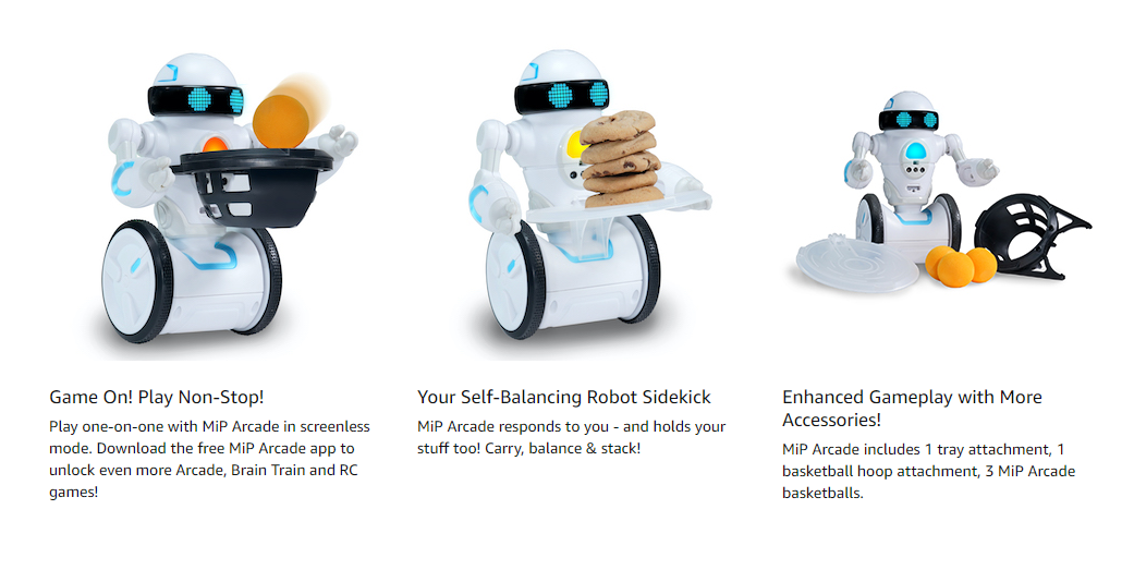 Дважды коснитесь головы MiP, когда он балансирует чтобы посмотреть, как он танцует! Когда MiP не балансирует, дважды коснитесь его головы, чтобы активировать режим записи. Аудиосигнал сообщит вам, когда начинать запись. Если вы все сделали правильно, вы услышите свою запись. Вставьте баскетбольную корзину в специальное отверстие в груди MiP. Светодиодный индикатор загорится оранжевым, указывая на то, что режим баскетбола активирован. Вставьте поднос в специальное отверстие в груди MiP. Ставьте предметы на поднос MiP и наблюдайте за тем, как он балансирует и забавно реагирует. Если роботу стало скучно или вы положили слишком много вещей на его поднос, он всё стряхнёт.