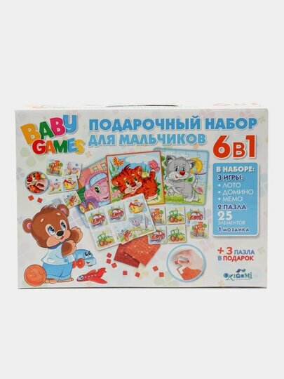 Подарочный набор 6 в 1 Для мальчиков — это уникальный набор, включающий в себя интересные красочные пазлы с милыми зверятами, будто сошедшими в детских открыток, а также целый ряд развивающих и обучающих настольных игр, благодаря которым ребенок узнает, что такое лото и домино, а также потренирует память.