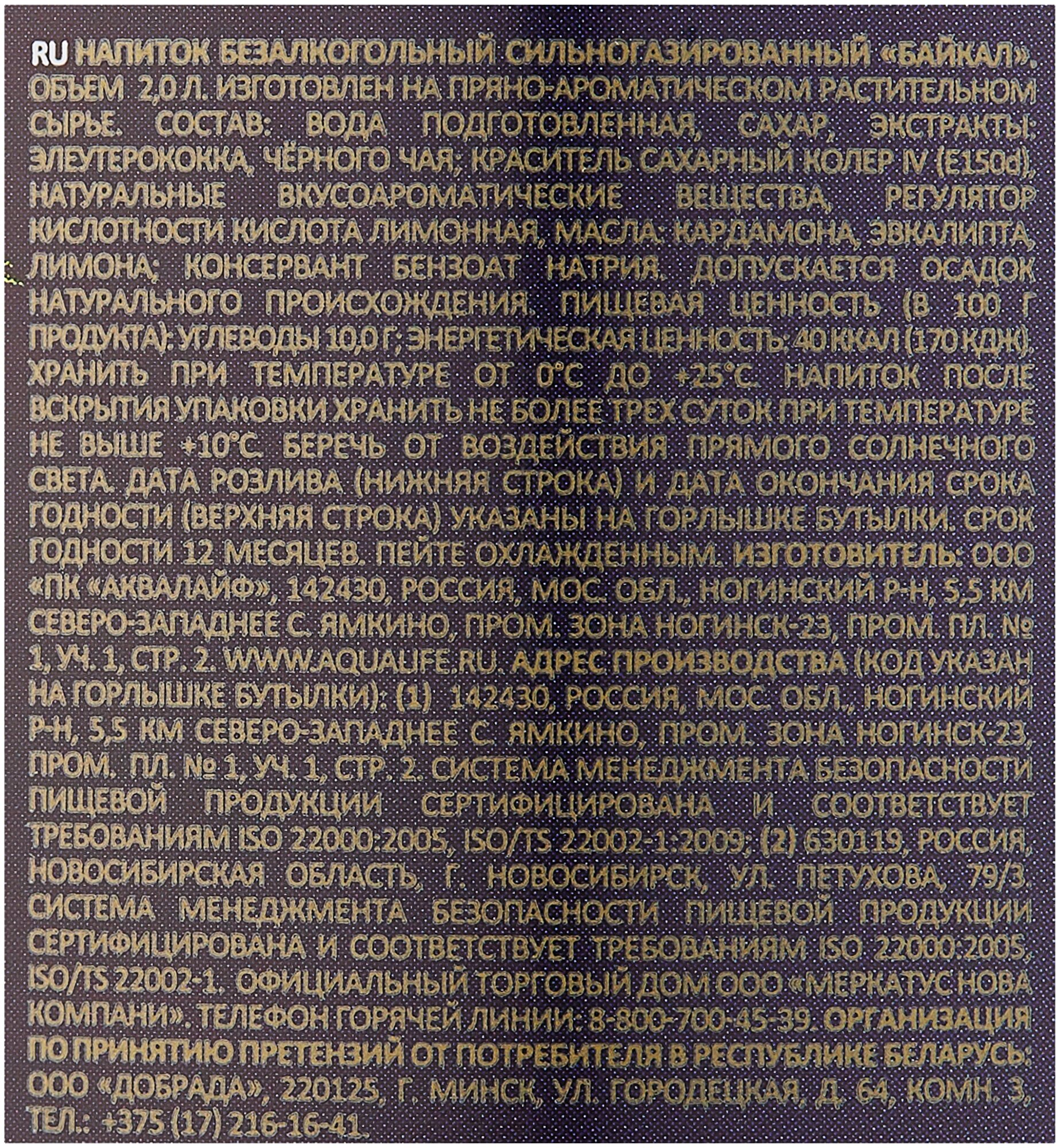Название напиток получил в честь озера Байкал - символа чистоты, уникальности и натуральности. Неповторимость напитку придают эфирные масла лимона, эвкалипта и кардамона. Терпкость - экстракт чая. Бодрость - элеутерококк.