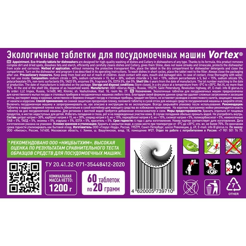 Назначение: Экологичные таблетки для посудомоечных машин Vortex Ultra All in 1 эффективно удаляют сложные загрязнения, в виде нагара, присохшей пищи, налета от чая и кофе, нейтрализуют запахи. Формула таблетки эффективна, содержит энзимы, без фосфатов и сильных отдушек, безопасна для природы, безвредна для септиков. Трехслойная таблетка в водорастворимой оболочке обеспечивает сохранность формулы, таблетку безопасно брать руками и класть в отсек машинки. Благодаря своей формуле данное средство удаляет сложные загрязнения и засохшие пятна, растворяет жиры и крахмал, качественно и бережно очищает посуду и столовые приборы, придает им блеск, не оставляет разводов и известкового налета, защищает машину от накипи и коррозии. Состав: цитрат натрия > 30%, карбонат натрия 15, но