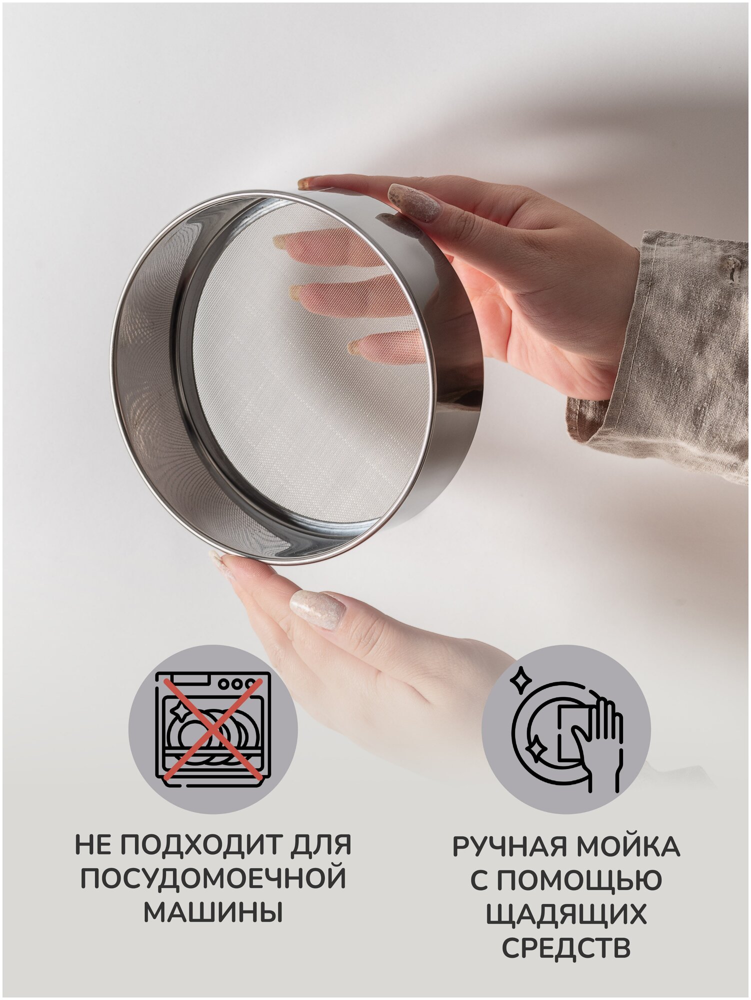 Сито Fino имеет ячейки мелкого размера и предназначено для просеивания сыпучих продуктов и промывания круп, овощей, ягод. Сито изготовлено из нержавеющей стали и прекрасно подходит для приготовления, как холодных, так и горячих блюд.Размеры изделия: диаметр: 15 см , высота: 4,5 см.Материалы изготовления: нержавеющая сталь 201, нержавеющая сталь 430.