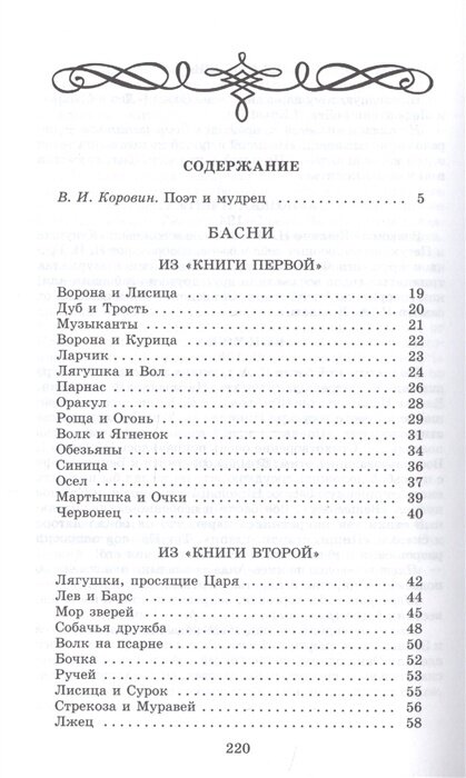 В данном издании представлено очень большое количество басен, практически каждая имеет отдельную иллюстрацию, занимающую собой целую полосу - то есть крупную и красивую. Очень уместно в книге выглядят вензеля, начинающие и заканчивающие каждую басню. Отдельно выделена мораль, для более легкого понимания ее школьниками.