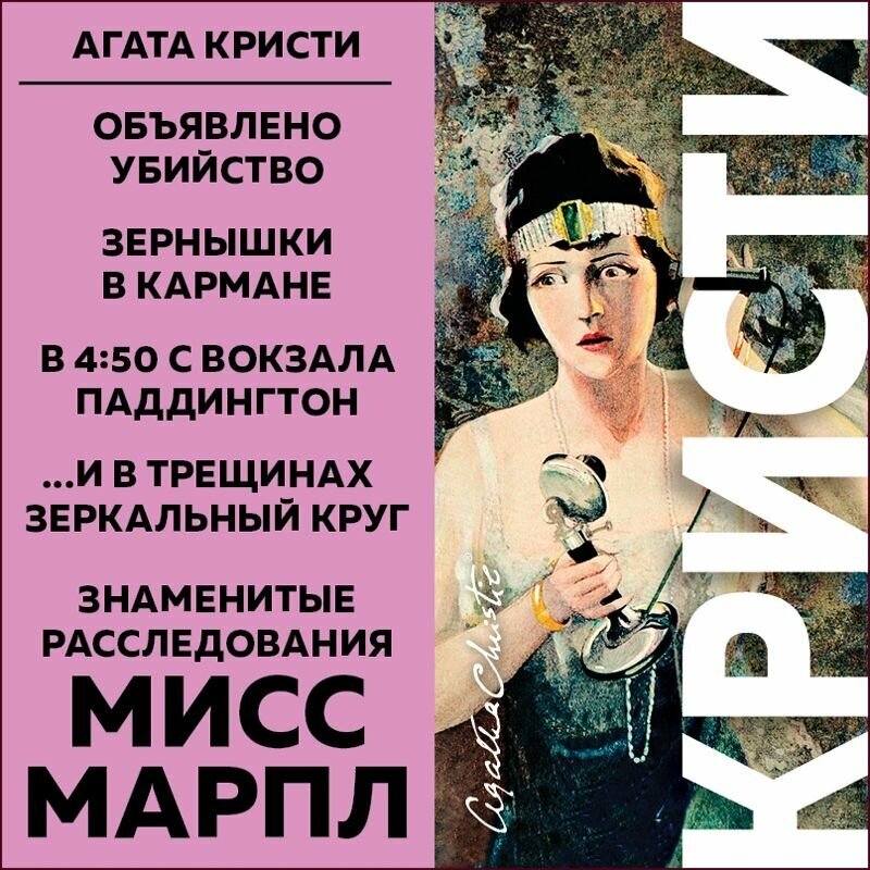Агата Кристи – непревзойденная королева детектива, совершившая революцию в криминальном жанре. Она хотела стать оперной певицей и композитором, в годы Первой мировой войны была сестрой милосердия, потом работала как фармацевт с ядами и ездила на раскопки в Египет. Бесстрашно летала на аэроплане, водила машину, обожала верховую езду, совершила кругосветное путешествие… Но прославилась она не этим, а своими многочисленными убийствами. В сборник вошли четыре знаменитых расследования из сериала о Мисс Марпл : "Объявлено убийство", " В 4:50 с вокзала Паддингтон", "Зернышки в кармане", " И в трещинах зеркальный круг".