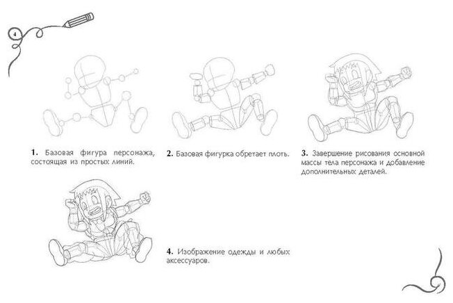 • как рисовать персонажей в различных классических стилях манги, включая кодомо, сёнэн, сёдзё, дзёсэй и сэйнэн;