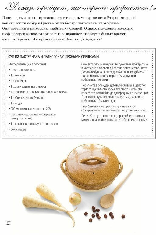 Отличная полиграфия, прекрасное качество бумаги, прошитые листы, издание приятно держать в руках и даже просто листать и разглядывать. Книга увеличенного альбомного формата. На страницах с отшивами имеются интересные тексты об истории овощей, разные советы, рецепты, примеры оформления и даже цитата из фильма «Амели» :)