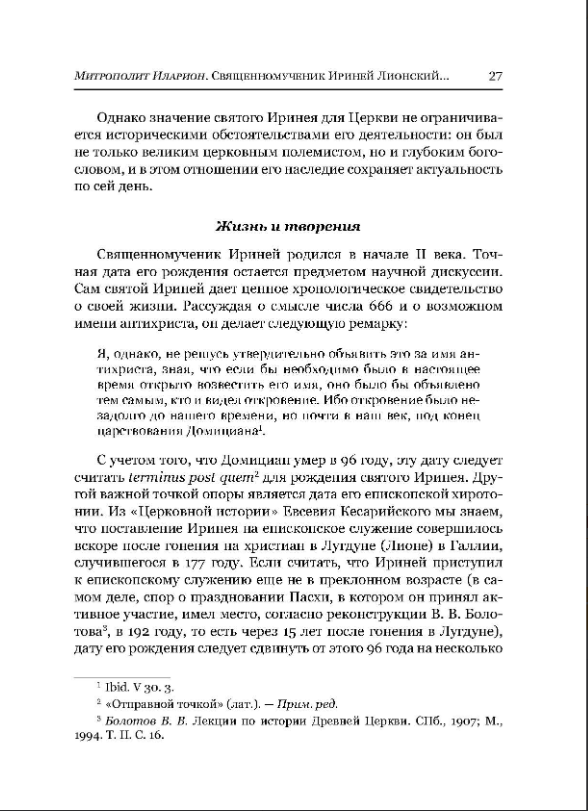 Священномученик Ириней Лионский был одним из первых Отцов Церкви, ведущим богословом II века, чья деятельность пришлась на один из самых трудных периодов в истории Церкви, когда ей приходилось противостоять гностическим течениям, представлявшим для христианства величайшую опасность. Однако святитель явился не только великим церковным полемистом, но и глубоким богословом, и в этом отношении его небольшое, но глубокое наследие сохраняет актуальность по сей день.