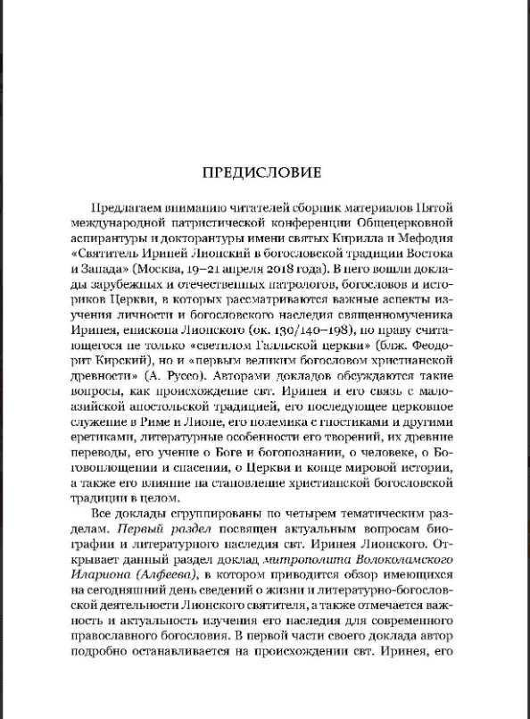 Сборник материалов V Международной патристической конференции Общецерковной Аспирантуры и Докторантуры на тему "Священномученик Ириней Лионский в богословской традиции Востока и Запада" включает доклады известных зарубежных и российских исследователей, в которых рассматриваются важные аспекты изучения личности и богословского наследия священномученика Иринея, епископа Лионского.