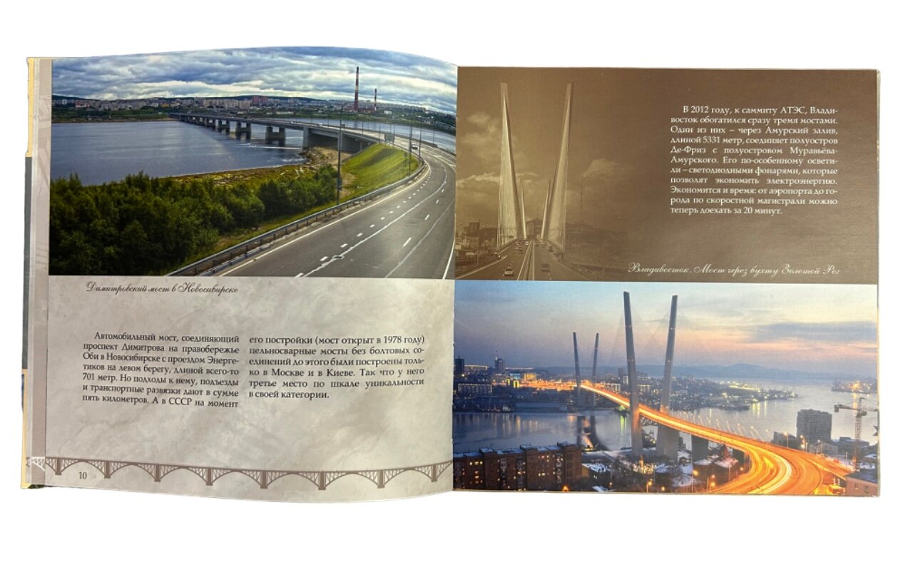 .В издании доступно и познавательно рассказывается о «самых-самых» мостах России и мира. «Рекордсмены» Владивостока, Красноярска, Хабаровска, Новосибирска, Москвы, Санкт-Петербурга, вантовый мост с материка на остров Русский, Живописный мост и «Мост-дракон» - все они по-своему прекрасны и уникальны.