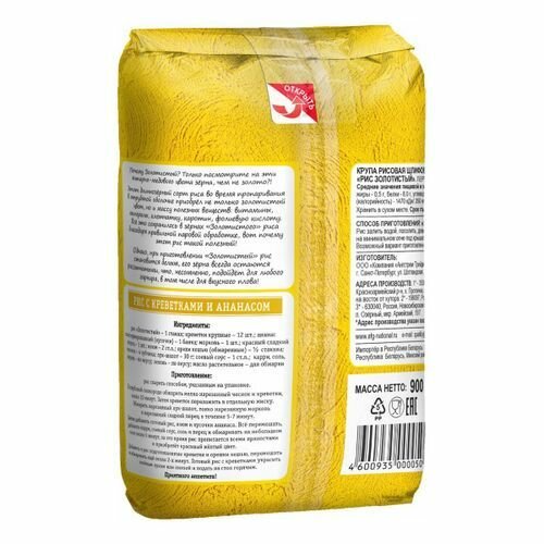 Длиннозёрный обработанный паром рис высшего стандарта качества. Благодаря специальной паровой обработке питательные вещества, минералы и витамины, содержащиеся в оболочке, поступают внутрь зерна, повышая его пищевую ценность. После обработки паром зерно приобретает медово-золотистый цвет, а в процессе варки снова становится белоснежным. При приготовлении рис «Золотистый» не слипается и не разваривается, прекрасно подходит для гарнирных блюд и плова.