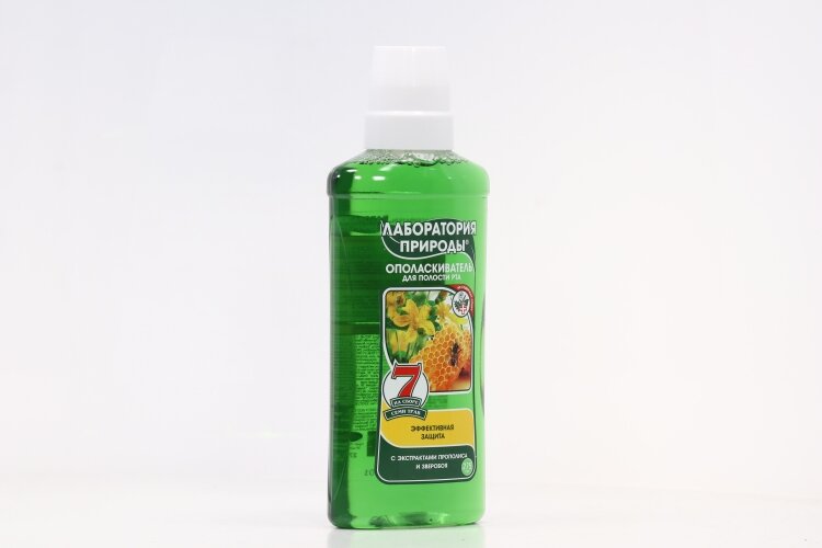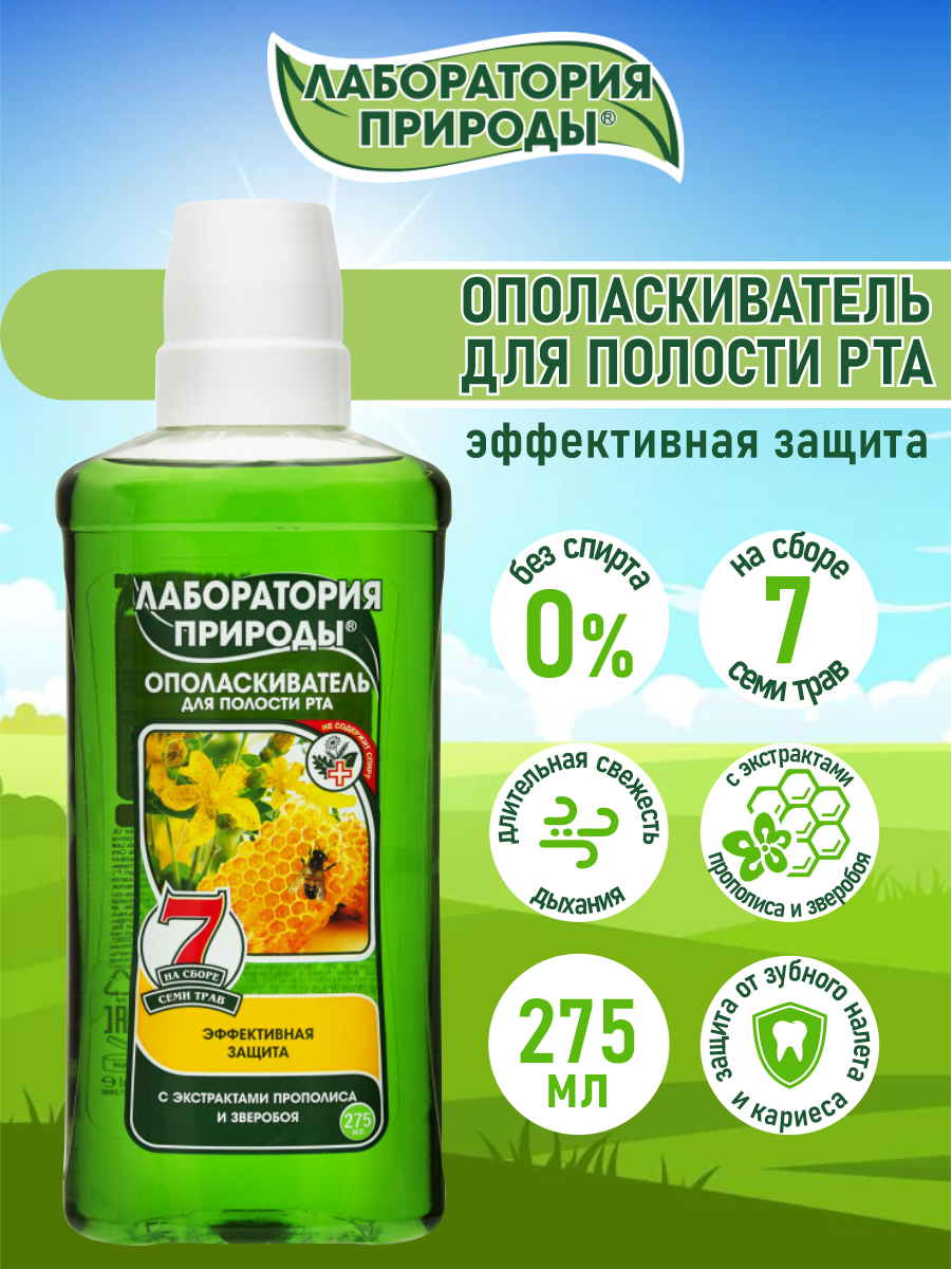 Экстракт прополиса успокаивает десны, снимает раздражение, ускоряет процесс восстановления тканей. Экстракт зверобоя снимает воспаление и кровоточивость, препятствует развитию бактерий в полости рта. Сбор семи целебных трав усиливает действие специальных экстрактов, укрепляет и защищает десны. Ополаскиватель «Лаборатория Природы» с экстрактами прополиса и зверобоя на сборе трав предназначен для особого ухода после 50 лет. Повышает защитную функцию полости рта, способствует устранению сухости во рту, улучшает состояние десен.