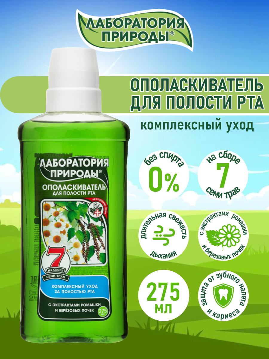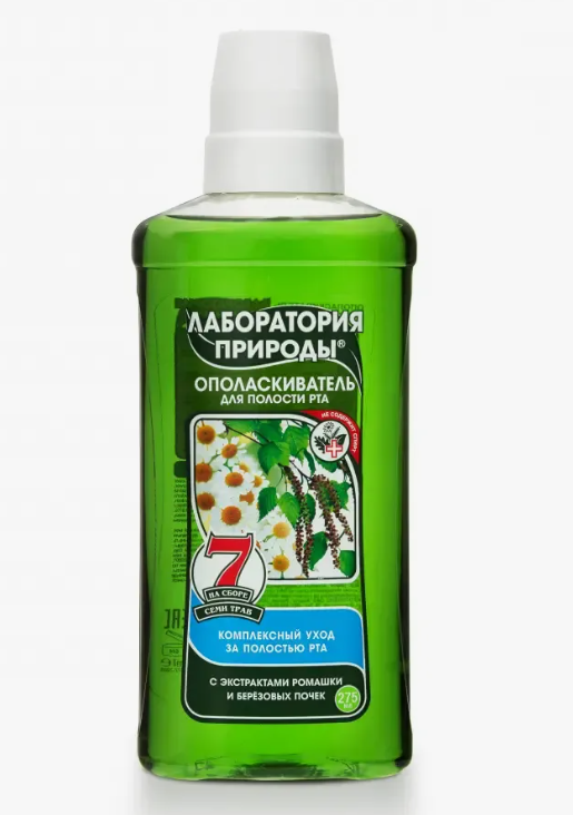 Экстракт ромашки успокаивает дёсны, снимает воспаление и кровоточивость, стимулирует заживление тканей Березовый сок препятствует размножению бактерий в полости рта, обладает защитным действием. Сбор семи целебных трав усиливает действие специальных экстрактов, укрепляет и защищает десны. Ополаскиватель «Лаборатория Природы» с экстрактами ромашки и берёзовых почек на сборе трав рекомендован для профилактики заболеваний пародонта. Замедляет скорость образования зубного налета, защищает от кариеса, придает длительную свежесть дыханию.