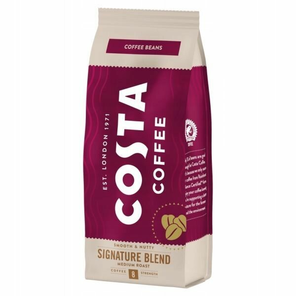 Описание товара:Только 5% кофейных зерен подходят для Costa Coffee поэтому мы закупаем кофе, выращенный исключительно на плантациях, сертифицированных по стандарту Rainforest Alliance. Насладитесь чашечкой ароматного кофе, произведенного с заботой о будущем фермеров и окружающей среде. Подходит для приготовления в кофеварках различных видов и френч-прессе. Крепость: 8/12. Signature blend - фирменный бленд. Основано в 1971 году итальянскими братьями Серджио и Бруно Коста. Они начали с доставки кофейных зёрен на стильных чёрных такси-кэбах в люксовые отели Лондона.Состав товара:Натуральный жареный кофе в зёрнах.Меры предосторожности:Хранить при относительной влажности не более 75%. После вскрытия упаковки продукт хранить в плотно закрытой ёмкости в холодильнике. Рекомендуем употребить в течение двух недель после вскрытия.