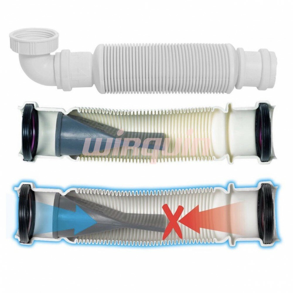Wirquin Senzo 1 1/4 31560002 защищен от протечек и неприятных запахов благодаря технологии "Сухой сифон". Внутри находится силиконовые мембраны, которые открываются при сливе воды из раковины, а потом плотно закрываются, не пропуская обратно поток со стороны канализации. Даже при гидроударах сифон остается сухим, в нем не скапливается жидкость и отходы. Мембраны также приоткрываются при движении воздушных потоков, впуская в себя свежий воздух, благодаря чему сифон вентилируется изнутри. Cифон сжимается и вытягивается, при необходимости сгибается до угла 90°, как по горизонтали, так и по вертикали.