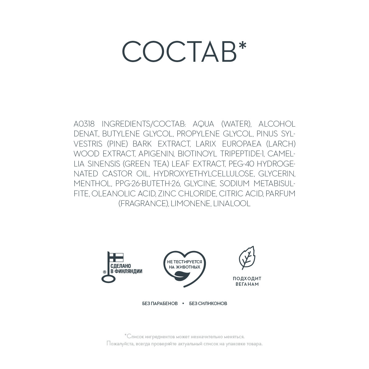 Состав: Aqua (Water); Alcohol Denat., Butylene Glycol; Pinus Sylvestris (Pine) Bark Extract; Larix Europaea (Larch) Wood Extract; Apigenin; Biotinoyl Tripeptide-1; Camellia Sinensis (Gren Tea) Leaf Extract; PEG-40 Hydrogenated Castor Oil; Hydroxyethylcellulose; Glycerin; Menthol; PPG-26-Buteth-26; Glycine; Sodium Metabisulfite; Oleanolic Acid; Parfum (Fragrance); Limonene; Linalool