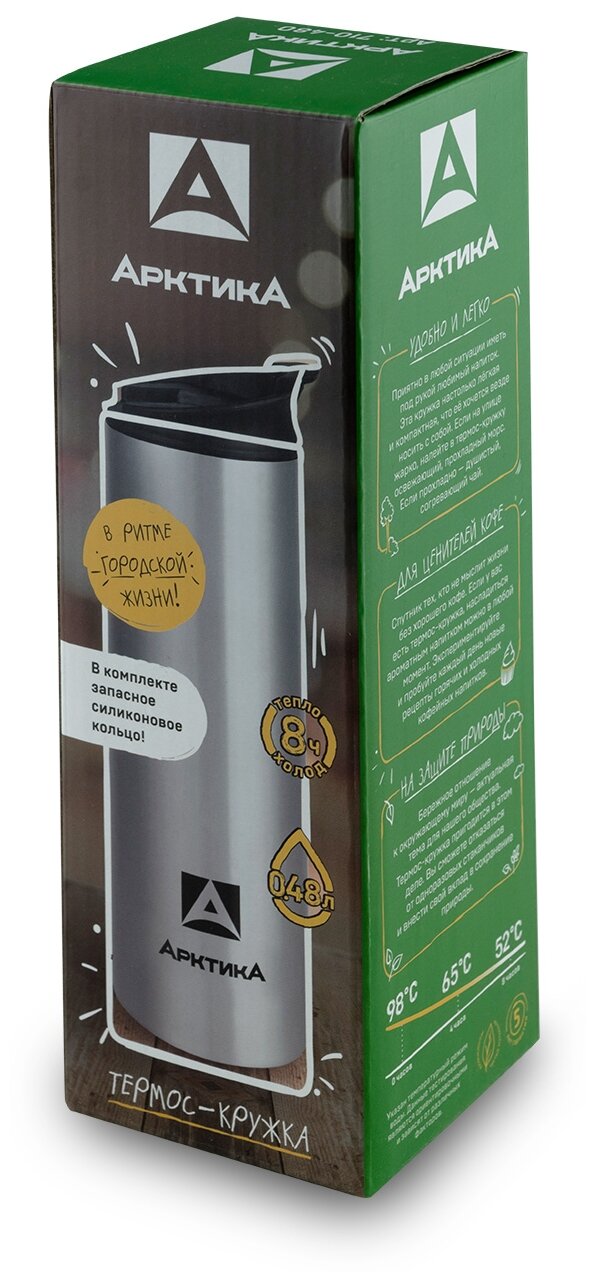 Прочие особенности и свойства | Термос-кружка вакуумная, облегченная, объем 0.48 л, крышка на резьбе с силиконовым уплотнителем, корпус с износостойким покрытием. Удобно расположить в сумке/рюкзаке, в подстаканнике в авто. |