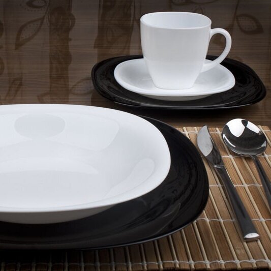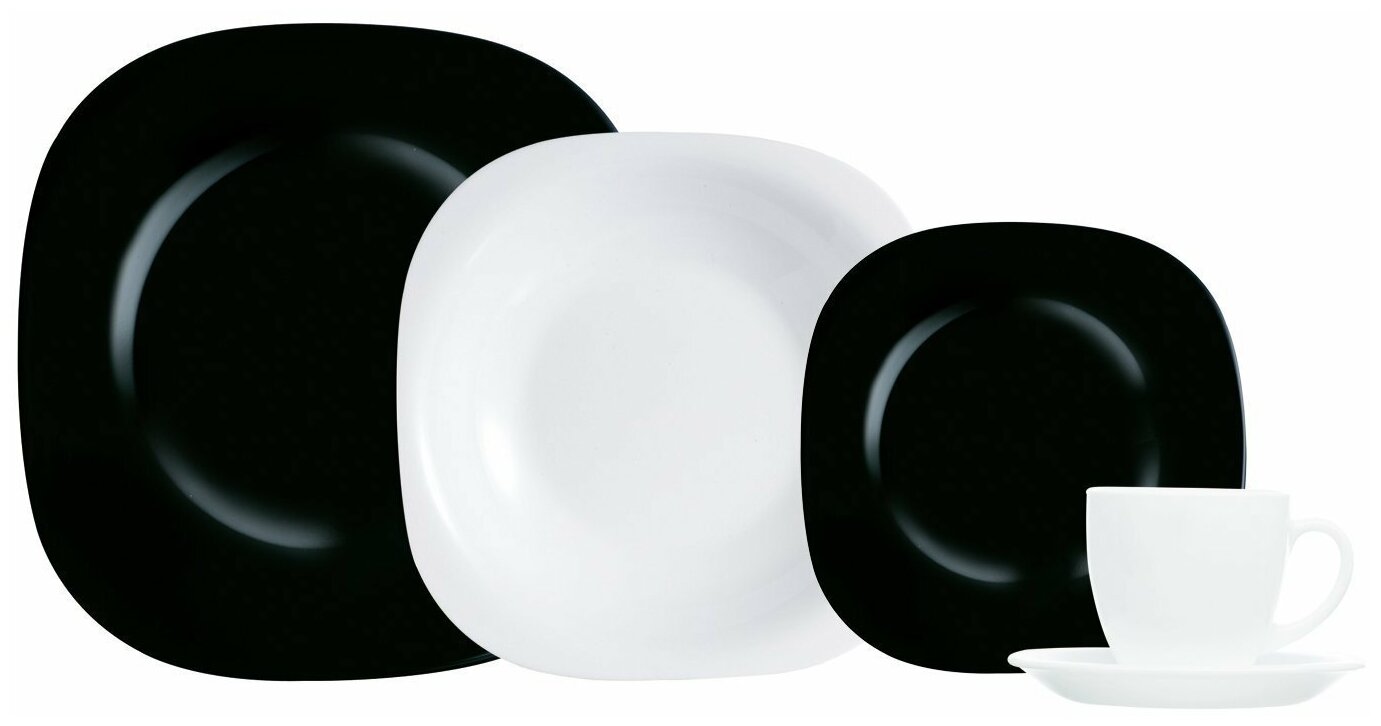 Материал: стекло. Подходит для посудомоечной машины. В комплекте: тарелка десертная 19см - 6 шт(черная), тарелка обеденная 26,5 см - 6 шт(черная), тарелка суповая 21 см - 6 шт(белая), чашка чайная белая 220 мл – 6 шт, блюдце чайное белое – 6 шт.