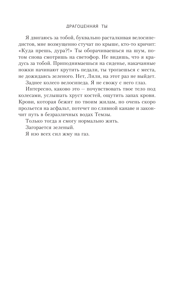 Борьба и непонимание между поколениями всегда останутся неизменными. Но что если добавить к этому жгучие обиды и ненасытную жажду мести? Получится довольно опасный коктейль, как в «Драгоценной ты». Я даже подумать не могла, что наткнусь в этой книге на столь оригинальное и яростное противостояние между женщинами, принадлежащих к разным поколениям. Писательница ярко показала всю разницу в восприятии ими себя и окружающего мира. У них разные способы выживания, но есть единая цель – уничтожить соперницу. Я до последнего не была уверена, как завершится этот триллер. Очень понравилось, как Хелен Тахар повернула события.