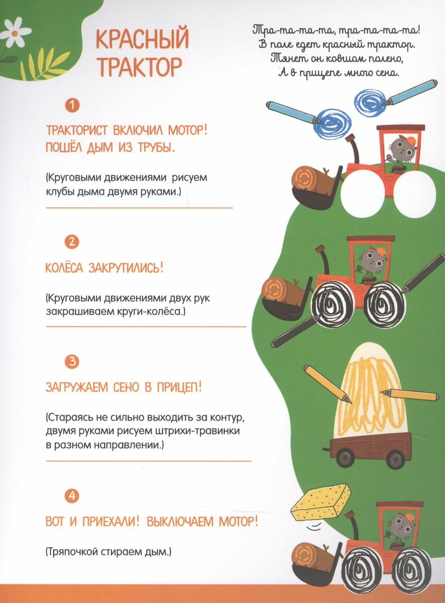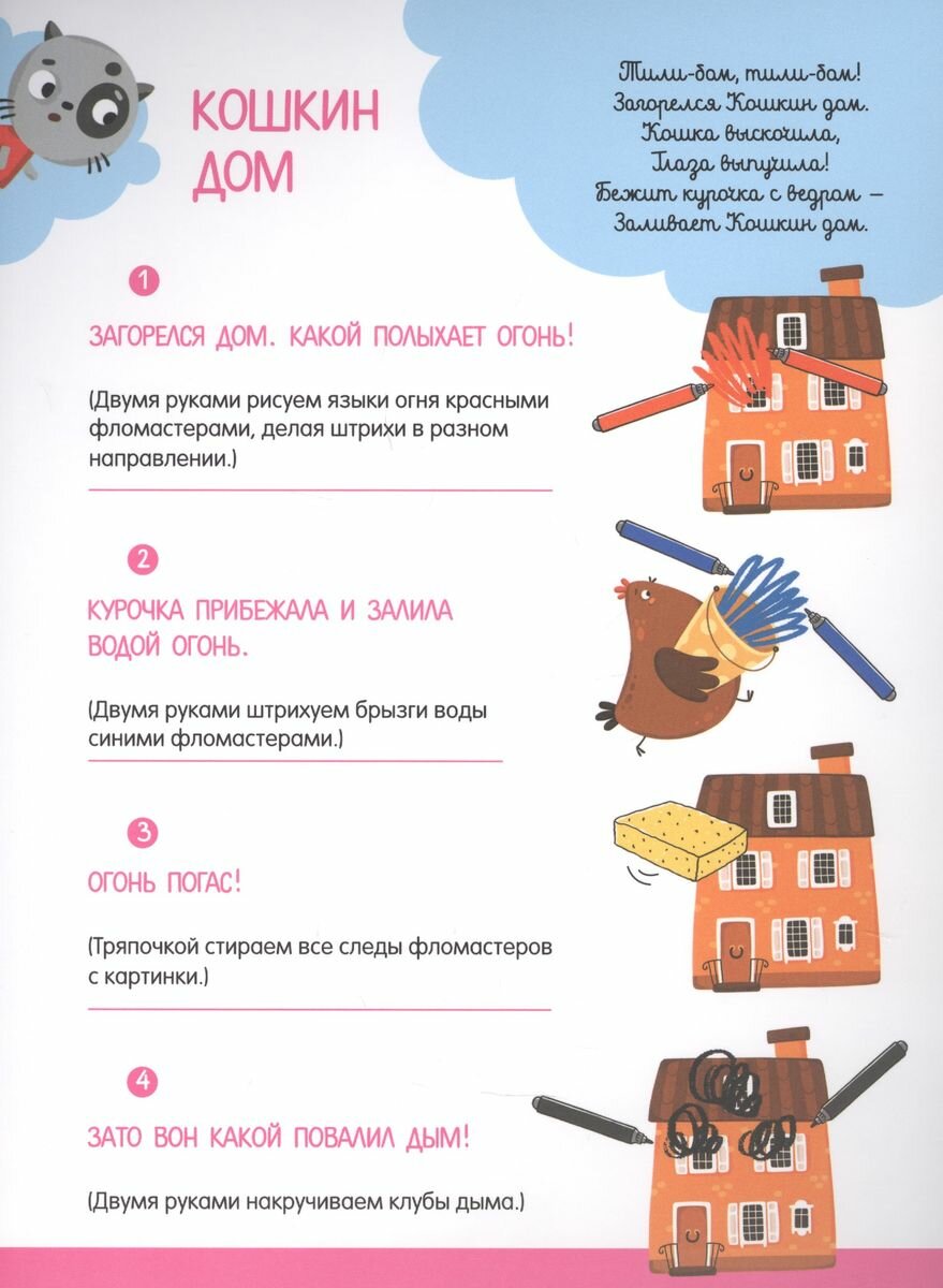 Каляки-маляки - выражение активного творческого начала малыша! Рисование двумя руками - отличная зарядка для мозга. В работу включаются сразу оба полушария и межполушарные связи. Дети, хорошо владеющие одновременно двумя руками активнее познают мир и развиваются гармонично. Занятие не более 5-10 минут. Понятная инструкция внутри. Рисовать на карточках можно фломастерами на водной основе и гуашевыми красками, а также специальными красками для пальчикового рисования. Предложите малышу рисовать и придумывать историю вместе с вами, а потом прочитайте короткий и ритмичный стишок по сюжету картинки. В комплекте 10 многоразовых карточек с особым матовым покрытием. На каждой карточке примеры заданий, пошаговая инструкция и веселая потешка или песенка, которая наверняка понравится вашему малышу. Заданий можно придумать еще больше. Ведь карточки для того и созданы, чтобы развивать творческие способности и воображение. Удобная папка с 10 многоразовыми карточками, на которых можно рисовать и стирать. Лицевая сторона - задание для ребенка с подсказками и вариантами. На обороте - подсказки для взрослых. Составитель Екатерина Баканова. Для занятий взрослых с детьми дошкольного возраста.