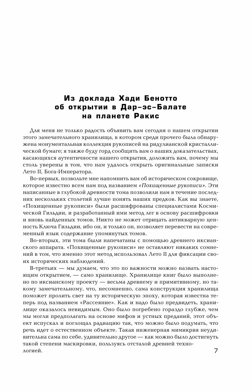 признатся дюну читаю первый раз.эту книгу и еще вторую трилогию заказал на будущее,начал читать с "батлерианского джихада" хотя многие фанаты не советовали читать в хронологическом порядке,говорят что имено оригинальная дюна это совсем другое.у джихада текст сложноватый как по мне,про дюну герберта ничего пока сказать немогу.но в свое время играл в игры по этой вселеной сутками и смотрел постановку Линча.сама книга оформлена отлично,бумага белая высокого качества. единственое но.....это мелкий шрифт,так что следует это учесть.
