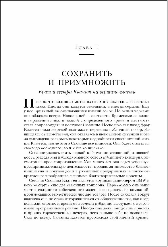 Готов согласиться с тем, что Квандты - удивительная семья! Создать огромную корпорацию, заработать такое количество денег и остаться на плаву, несмотря на все трудности и преграды, коими кишит мир бизнеса. Книга не только невероятно интересна, но и является прекрасной мотивацией для молодых бизнесменов.