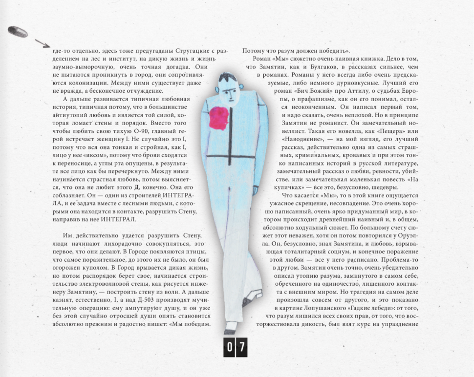 Роман этот об «обществе равных», в котором человеческая личность сведена к «нумеру». В нем унифицировано все – одежда и квартиры, мысли и чувства. Нет ни семьи, ни прочных привязанностей… Об этом хорошо сказал Дмитрий Быков: «Автор очень точно и убедительно описал утопию разума, замкнутого в самом себе, обреченного на одиночество, лишенного контакта с внешним миром. По мысли Замятина, главная трагедия в том, что человек может победить в себе зверя, уйти в чистое царство рациональности, которое окажется губительно для человечества».