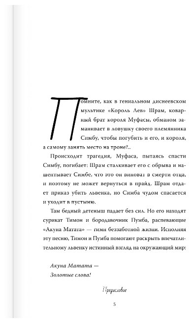 И это правильно: добро пожаловать в мир философии наслаждения, радости и пофигизма – Акуна Матата! Она доказывает: когда ты не «паришься», живешь в свое удовольствие, радуешься жизни, любишь себя, людей и весь мир, то становишься счастливчиком, обласканным богиней Фортуной. Жизнь сама преподносит тебе всё на тарелочке с голубой каемочкой. В общем, пой, развлекайся, не заморачивайся на проблемах – и все само утрясется… а каким образом, не так уж и важно.