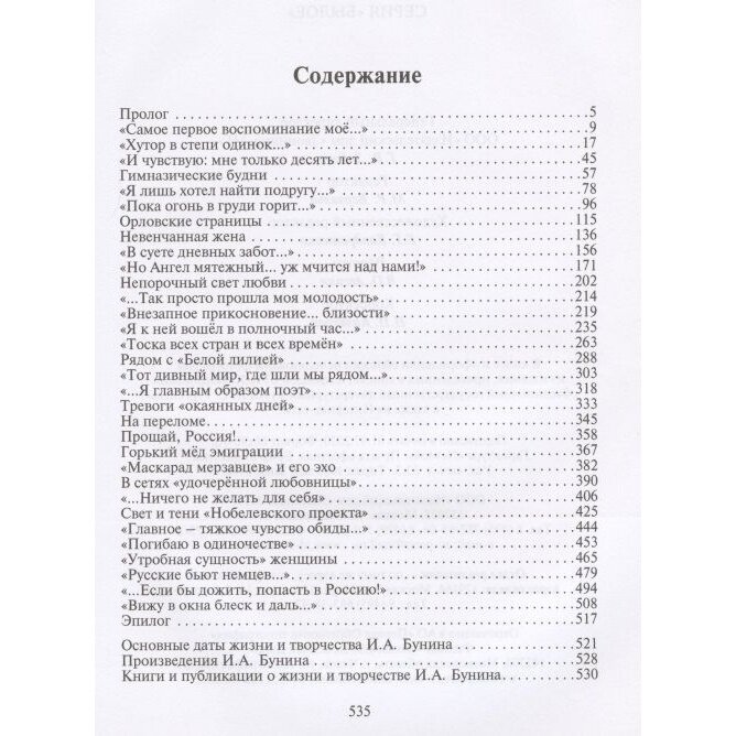 В книге также рассказывается о нравственной трагедии Бунина-эмигранта, вынужденного покинуть Родину, о его всеобъемлющей любви к России, русской природе, женщинам, любви, которая на протяжении всей жизни писателя играла роль движущей силы его литературного творчества.