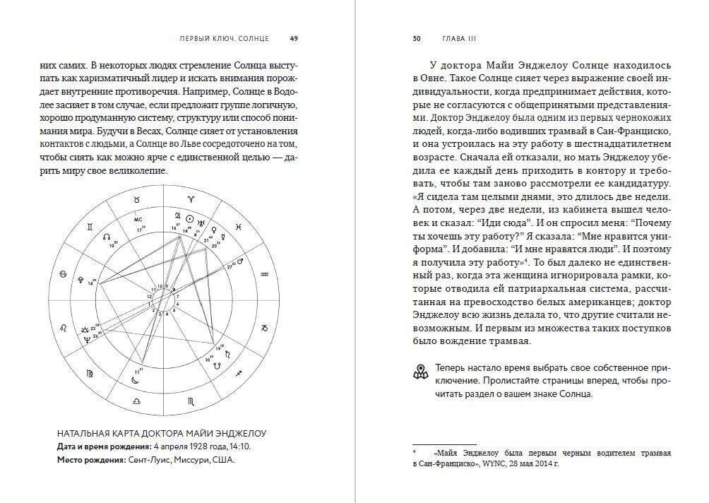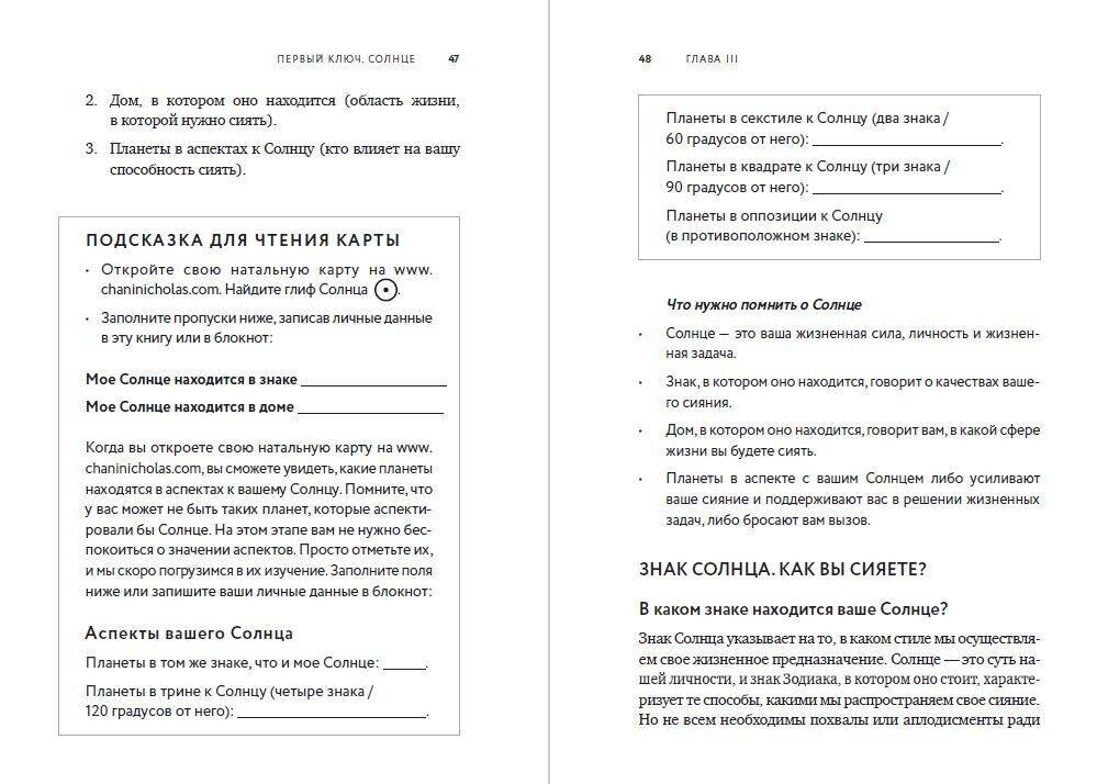 Первый ключ – Солнце: он отвечает за вашу основную задачу и сферу, в которой вам предназначено сиять. Второй ключ, Луна, связан с вашими физическими и эмоциональными потребностями, он показывает, как лучше всего распределить свои жизненные задачи в повседневности. Третий ключ, Асцендент и его управитель, символизирует основную мотивацию человека. По мнению Николас, разгадки тайны этих трех ключей вполне достаточно, чтобы понять себя и безошибочно определить свое жизненное направление.