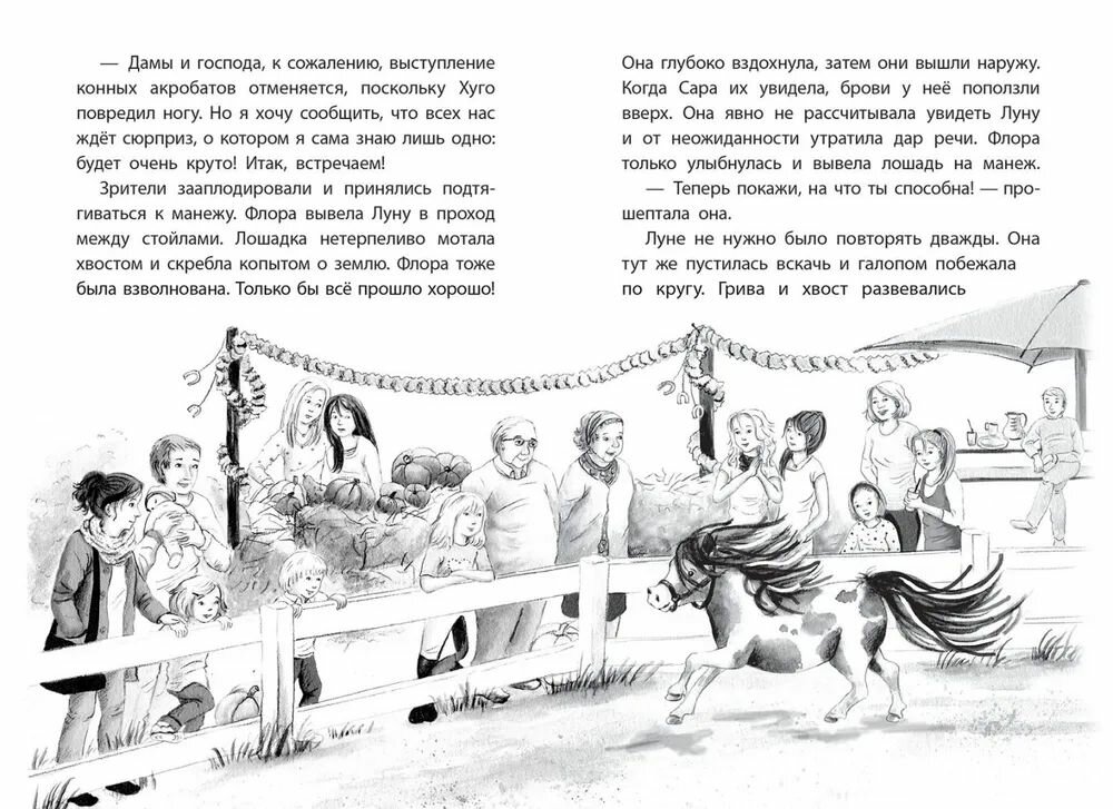 На конюшне, куда Флора с удовольствием ходит вместе с Мири, появилась новая лошадка. Луна, шотландский пони, с первого дня стала вести себя очень странно и никак не могла поладить с другими лошадьми. Флора и её сова наверняка ей помогут: ведь Златокрылка умеет разговаривать с животными. Для этого нужно лишь немного волшебства…