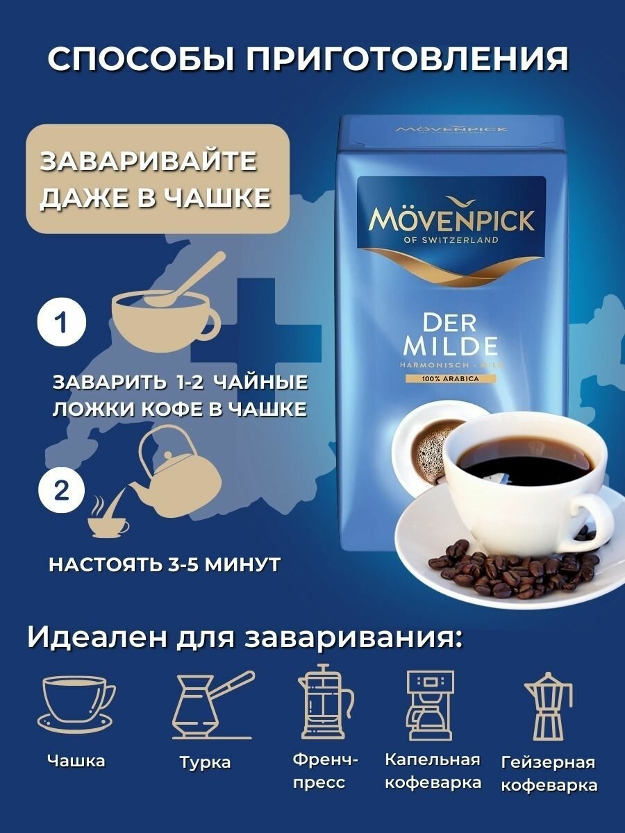 Кофе молотый Movenpick der Milde 500 г (вакуумная упаковка). Movenpick Der milde от J.J.Darboven - отличный кофе от знаменитого швейцарского бренда. Для этого кофе отобраны кофейные зерна из лучших горных областей, выращивающих кофе. Нежная и медленная обжарка придает Movenpick Der Milde легкий аромат и мягкий, чуть терпковатый вкус с деликатной горчинкой. Он понравится поклонникам классики: приятный, естественный кофейный вкус без кислинки, умеренная крепость и универсальность в приготовлении.