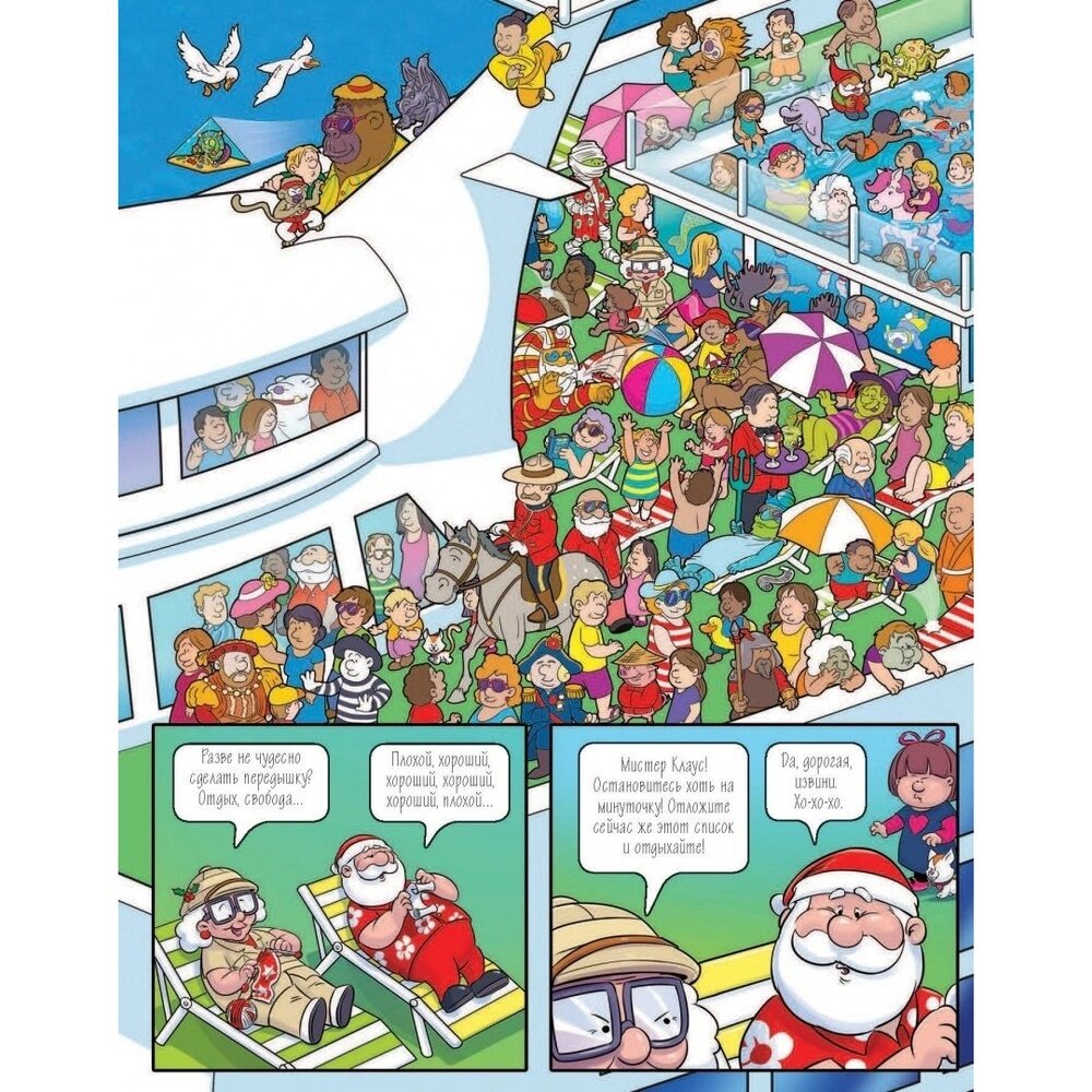Книга с загадками на внимание. Санта-Клаус со своей супругой отправляются в путешествие вокруг света. Впереди долгожданный отпуск, ведь и волшебникам нужно отдыхать! Санта-пару ждут самые прекрасные города мира и самые восхитительные впечатления. Но за ними увязалась Гадкая Нэт, которая хочет стащить у Санты список плохих и хороших детишек. Найди Санту первым! Иначе Гадкая Нэт выследит его и завладеет заветным списком.