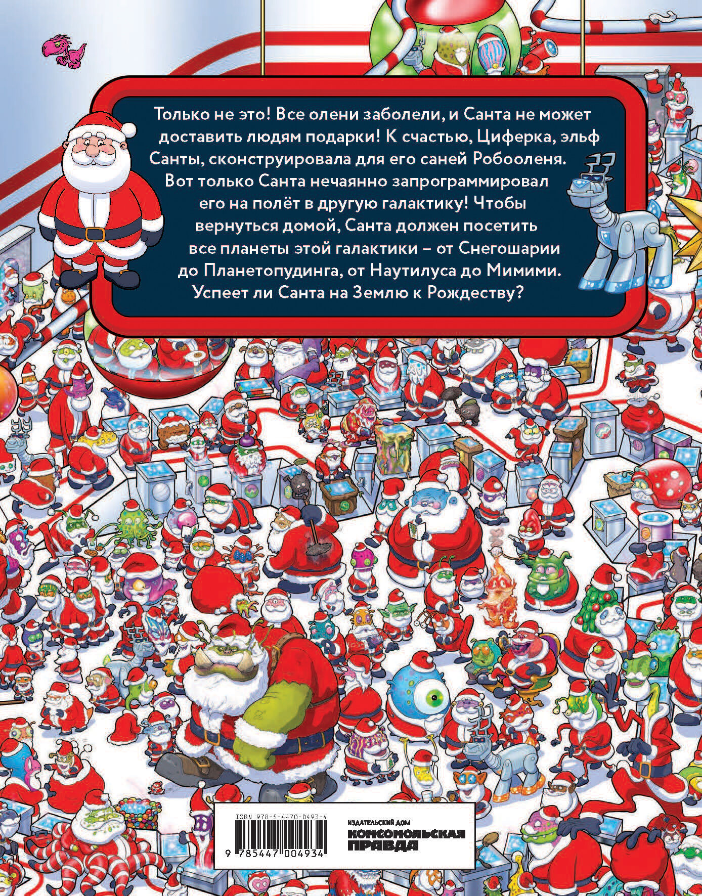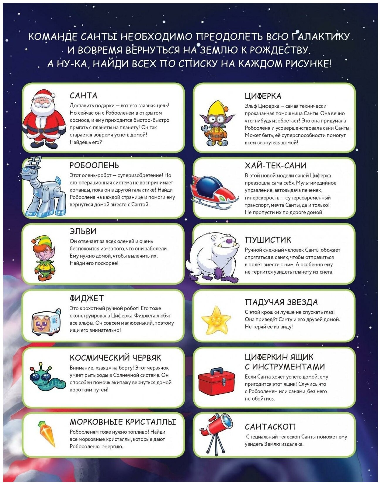 Книге с загадками на внимание. Чрезвычайное происшествие накануне Рождества! Нужно найти космический портал среди множества артефактов, чтобы помочь Санте вернуться на Землю, или праздник под угрозой срыва! Все олени заболели, и Санта не может доставить людям подарки! К счастью, Циферка, эльф Санты, сконструировала для его саней Робооленя. Вот только Санта нечаянно запрограммировал его на полет в другую галактику! Чтобы вернуться домой, Санта должен посетить все планеты этой галактики – от Снегошарии до Планетопудинга, от Наутилуса до Мимими. Успеет ли Санта на Землю к Рождеству?