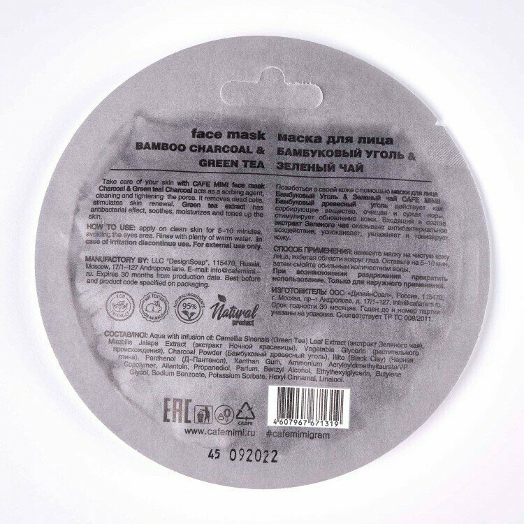 Маска для лица Cafe Mimi Бамбуковый Уголь и Зеленый чай 10мл Дизайнсоап