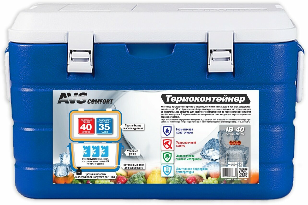 Термоконтейнер AVS (АВС) имеет вместимость 40 литров и долгое время сохраняет продукты холодными и свежими. Корпус контейнера изготавливается из прочно пластика и может использоваться в качестве стула, так как выдерживает вес до 100 кг. Крышка контейнера плотно фиксируется с помощью специальных защелок, а для транспортировки предусмотрены две удобные боковые ручки.