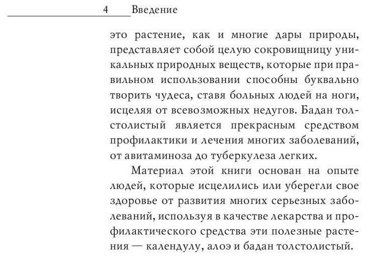"Три орудия есть у врача - слово, нож и растение", - говорили древние. Календула и алоэ - целебные растения, с помощью которых люди многих стран издавна лечились от разнообразных недугов. Календула была известна еще в Древней Греции, а целебные свойства алоэ были открыты более ЗЗОО лет назад. Известно, что в старинный эликсир долголетия входил выпаренный из листьев алоэ сок - сабур. Препараты из этих растений оказывают помощь при болезнях желудочно-кишечного тракта, гипертонии, бессоннице, ожогах, сердечно-сосудистых, кожных, гинекологических и многих других заболеваниях. Бадан толстолистый в России не так известен. Однако это растение представляет собой целую сокровищницу уникальных природных веществ, которые при правильном использовании способны буквально творить чудеса.