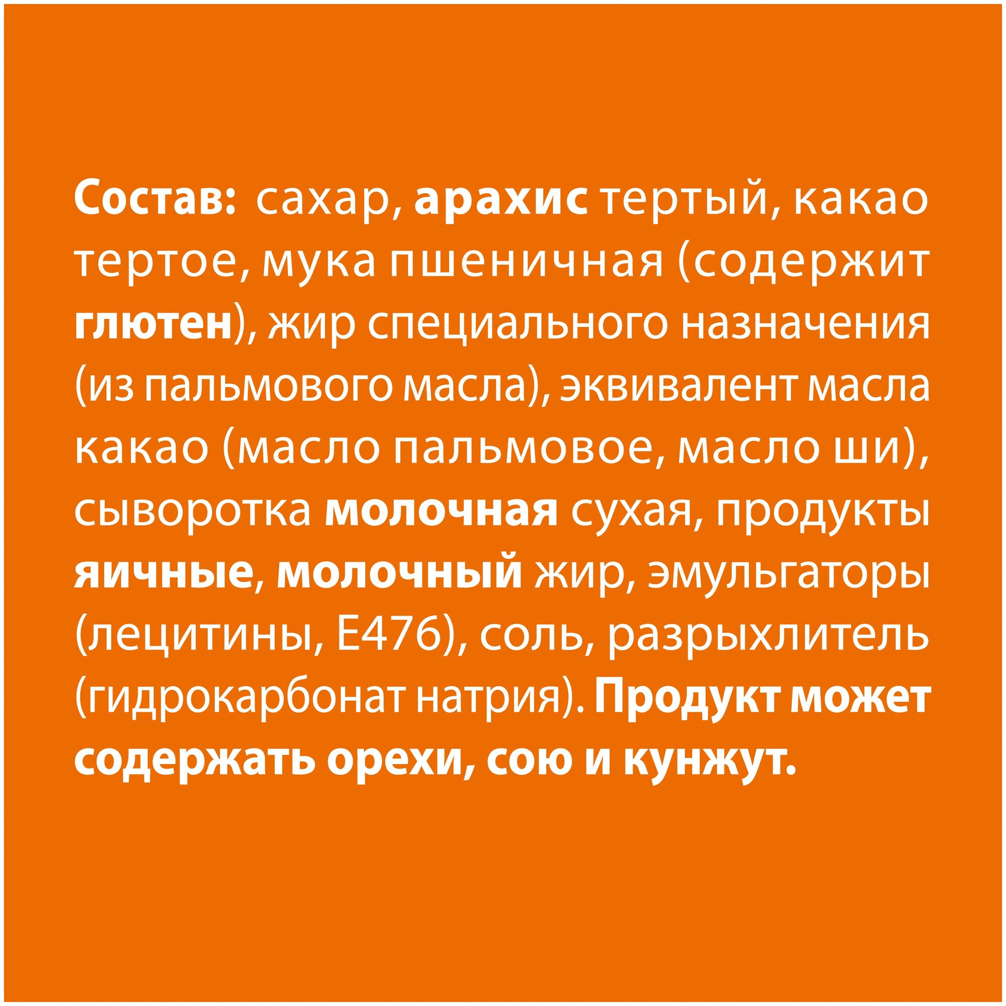 | Состав | сахар, арахис тертый (21%), какао тертое (11,1%), вафля (10,1%) (мука пшеничная (содержит глютен), продукты яичные, разрыхлитель (гидрокарбонат натрия), соль), жир специального назначения (масла пальмовое, ши), эквивалент масла какао (масла пальмовое, ши), сыворотка молочная сухая, молочный жир, эмульгатор (соевый лецитин), Е476), напиток винный, продукт содержит орехи |