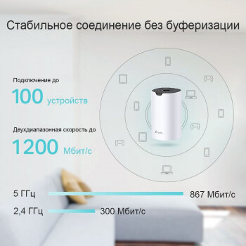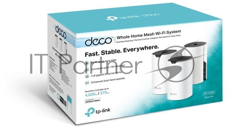 | Дополнительная информация | Deco S4 использует три модуля для бесшовного Wi-Fi — раз и навсегда устраните зоны со слабым сигналом!,Благодаря технологии Deco Mesh модули создают единую сеть Wi-Fi с одним именем. При перемещении по дому устройства будут автоматически переключаться между модулями Deco для достижения максимально возможной скорости.,Deco S4 с тремя модулями обеспечивает покрытие Wi-Fi на расстоянии до 370 м? †. А если этого недостаточно, увеличьте покрытие, добавив больше модулей Deco.,Deco S4 обеспечивает быстрое и стабильное подключение со скоростью до 1167 Мбит/с† и работает со всеми основными интернет?провайдерами.,Deco справится с передачей данных даже в самых загруженных сетях, обеспечивая непрерывное соединение не более чем для 100 устройств†.,Родительский контроль позволит ограничить время в сети и заблокировать нежелательный контент в соответствии с уникальными профилями, созданными для каждого члена семьи.,Благодаря пошаговой инструкции в приложении Deco настройка не отнимет много времени. |