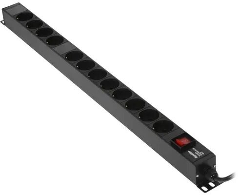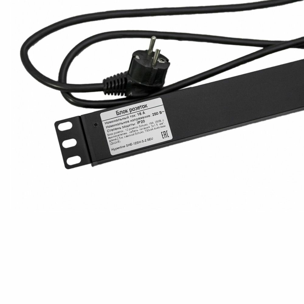 Hyperline Блок розеток, вертикальный, 12 розеток Schuko, выключатель с подсветкой, кабель питания 2.5м (3х1.5мм2) с вилкой Schuko 16A, 250В, 730x44.4x44.4 мм (ДхШхВ), корпус алюминий, черный (086839)